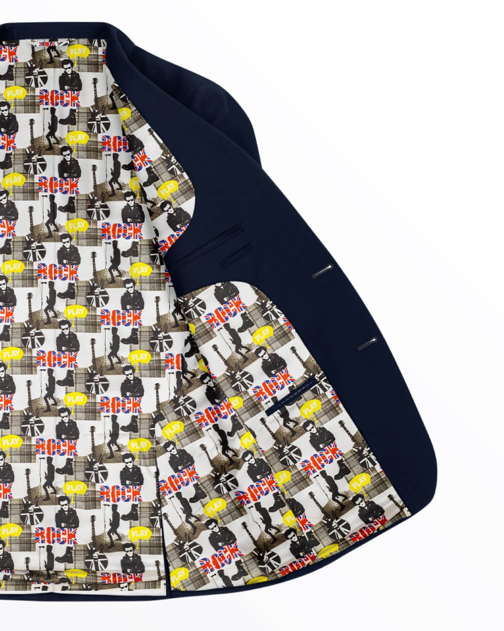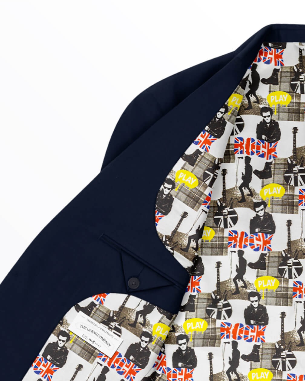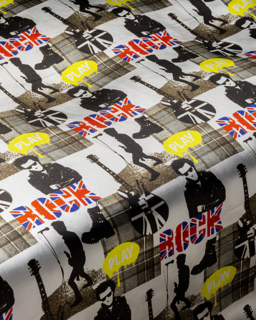 Brit Rock is a graphic, dynamic lining drawing on the evolution of British rock music and its eternal cultural impact. The powerful imagery, from Union Jack guitars to punk rock silhouettes, creates a collage of iconic sounds familiar in smoky club stages to the biggest festivals. Punchy colour accents offset the black-and-white base for a lining that’s effortlessly cool.