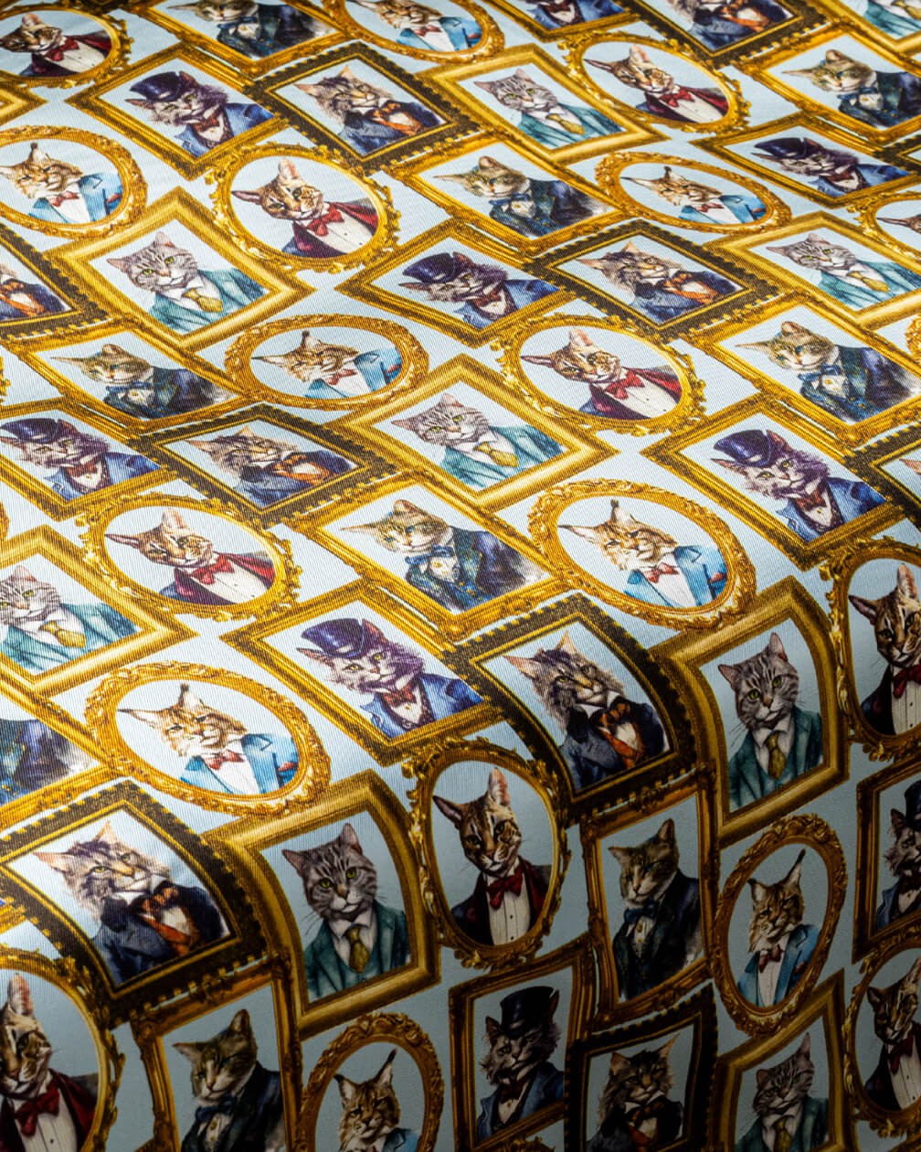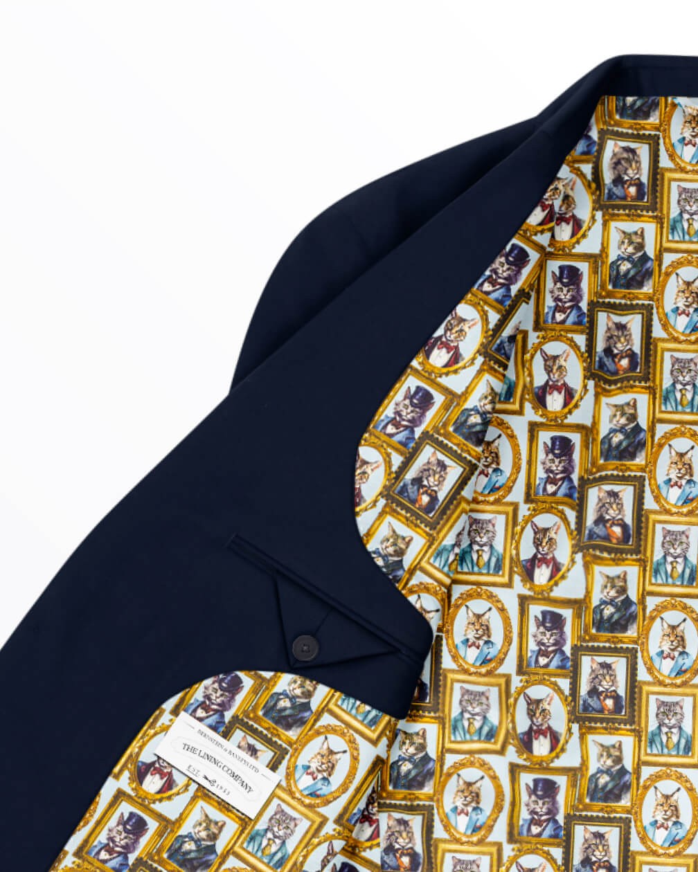 Created in response to specific customer demand, Cat Suits is a playful, characterful lining featuring portraits of impeccably dressed “aristocats” within gilded gold frames. Set against a clean pale background, the gallery-style layout feels quirky yet suave, making it a true conversation piece inside any outfit. A design crafted for real cat people.