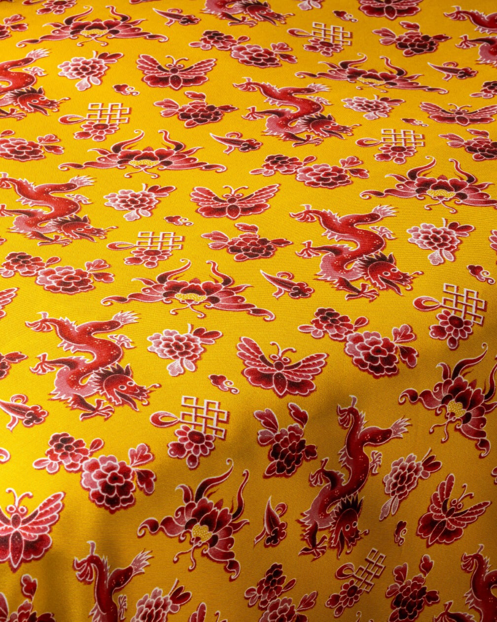 Fire Dragon celebrates the dragon in its most commanding form, expressing heat, action and authority through a striking interplay of colour and form. Against a luminous golden base, richly detailed red dragons surge between ornate florals and traditional motifs, its strong palette matching the warmth and prosperity rooted in Chinese artistry.