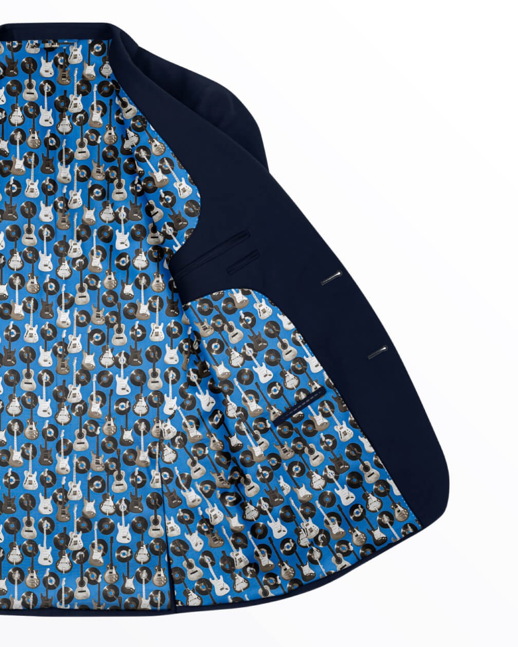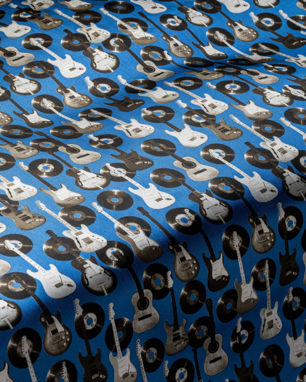 Our Guitars/Vinyl design brings together two iconic symbols of modern music: the guitar and the record, arranged in a lively all-over print. Set against a cool blue background, the monochrome instruments and discs create a striking contrast full of rhythm. Ideal for wearers who like their style to come with a rock-and-roll spirit.
