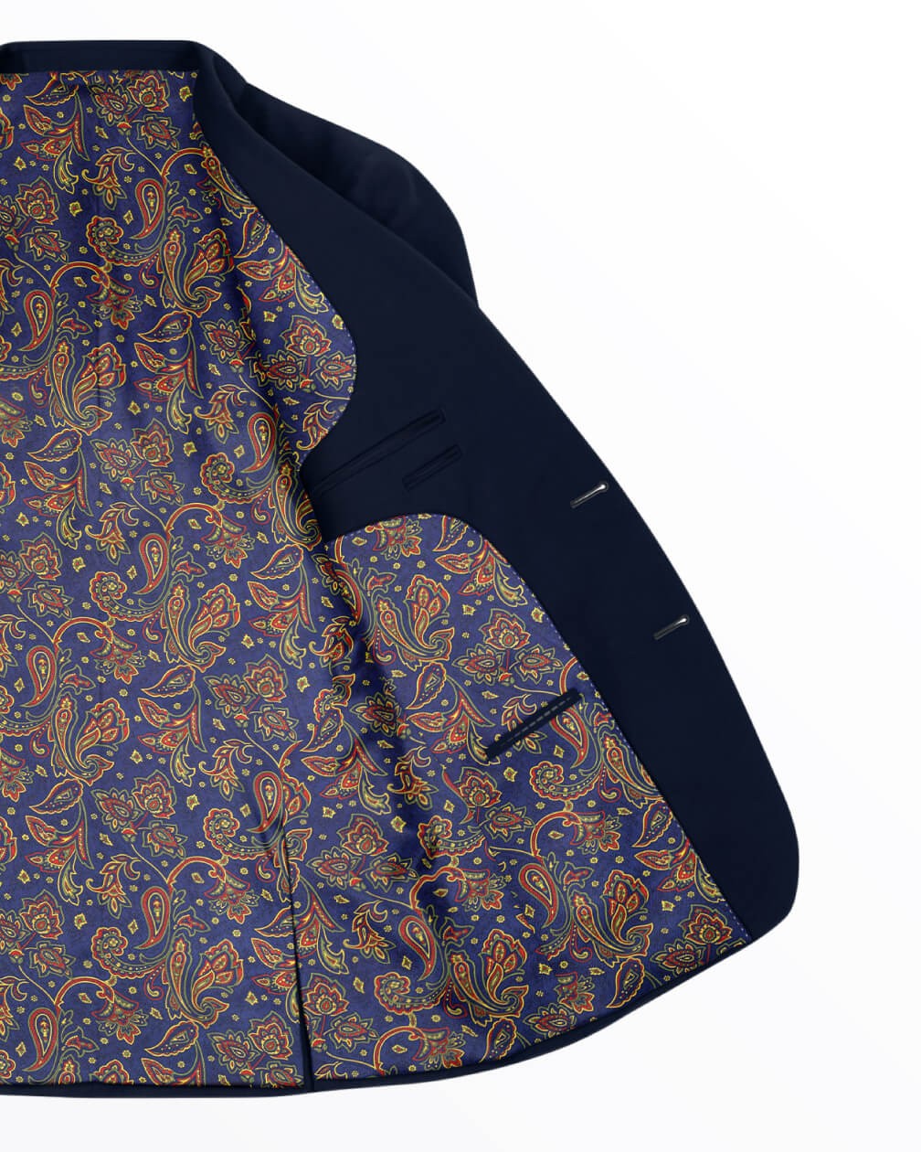 Navy Paisley draws on the everlasting elegance of paisley patterns, set against a deep navy base for added depth and sophistication. The lush gold and red tones and finely worked motifs give a composed, almost ceremonial feel, ideal for classic tailoring. It’s a lining that speaks softly but assuredly, and loved by those who appreciate the little details.