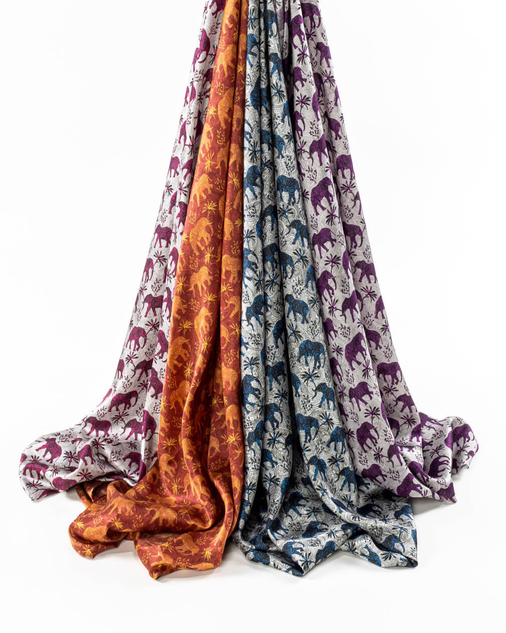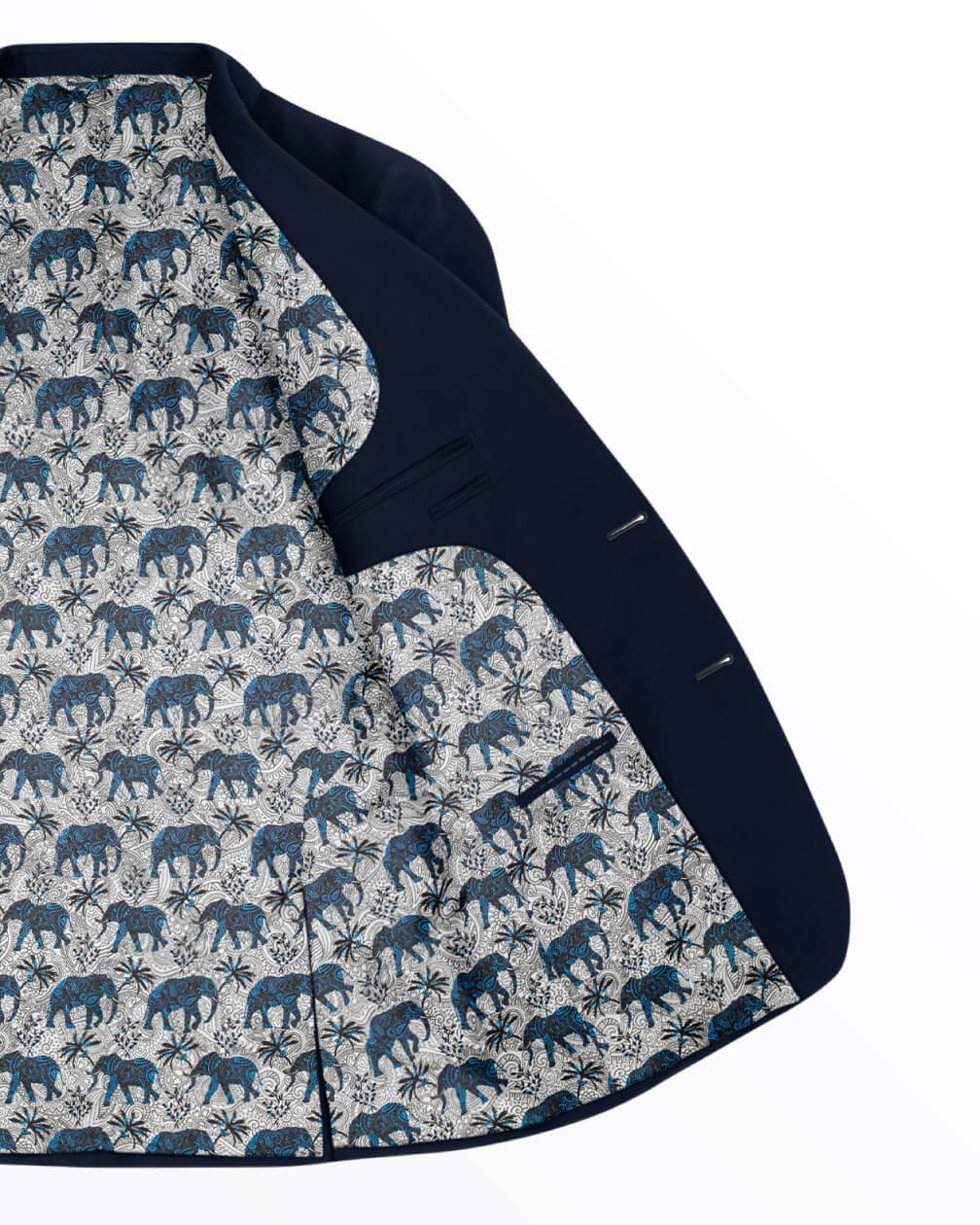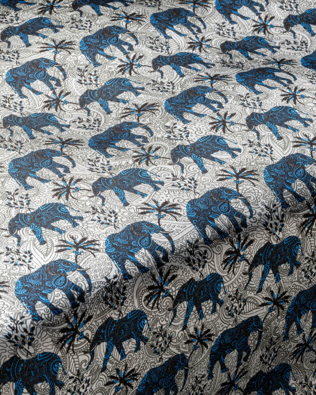 A standout bestseller among our design linings, our Blue/Silver version is admired for its calm sophistication and ornate artistry. Paisley-patterned blue elephants flow across a pale silver base, lending an air of tranquility and understated conviction. The measured palette and steady composition ensure a lining that is loved by tailors, designers and wearers.