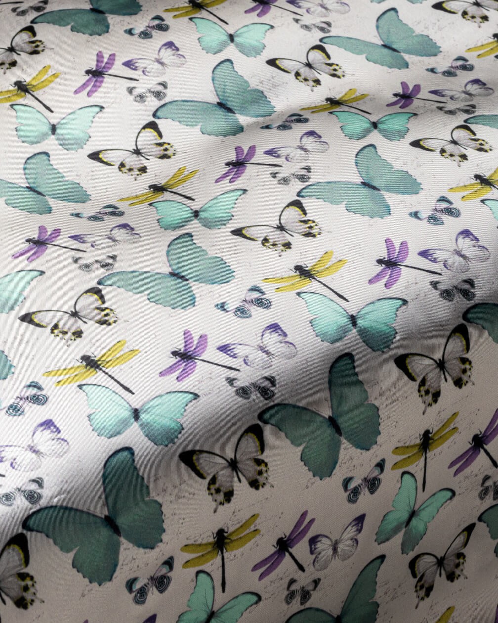 A much-loved design with our customers, Papillon (French for butterfly) blends subtlety and charm with a feel of motion. Butterflies and dragonflies drift along the lightly textured base in cool shades of teal, sage and lilac. It’s an airy composition with undying appeal, making it a popular choice for those who appreciate finesse both inside and out.