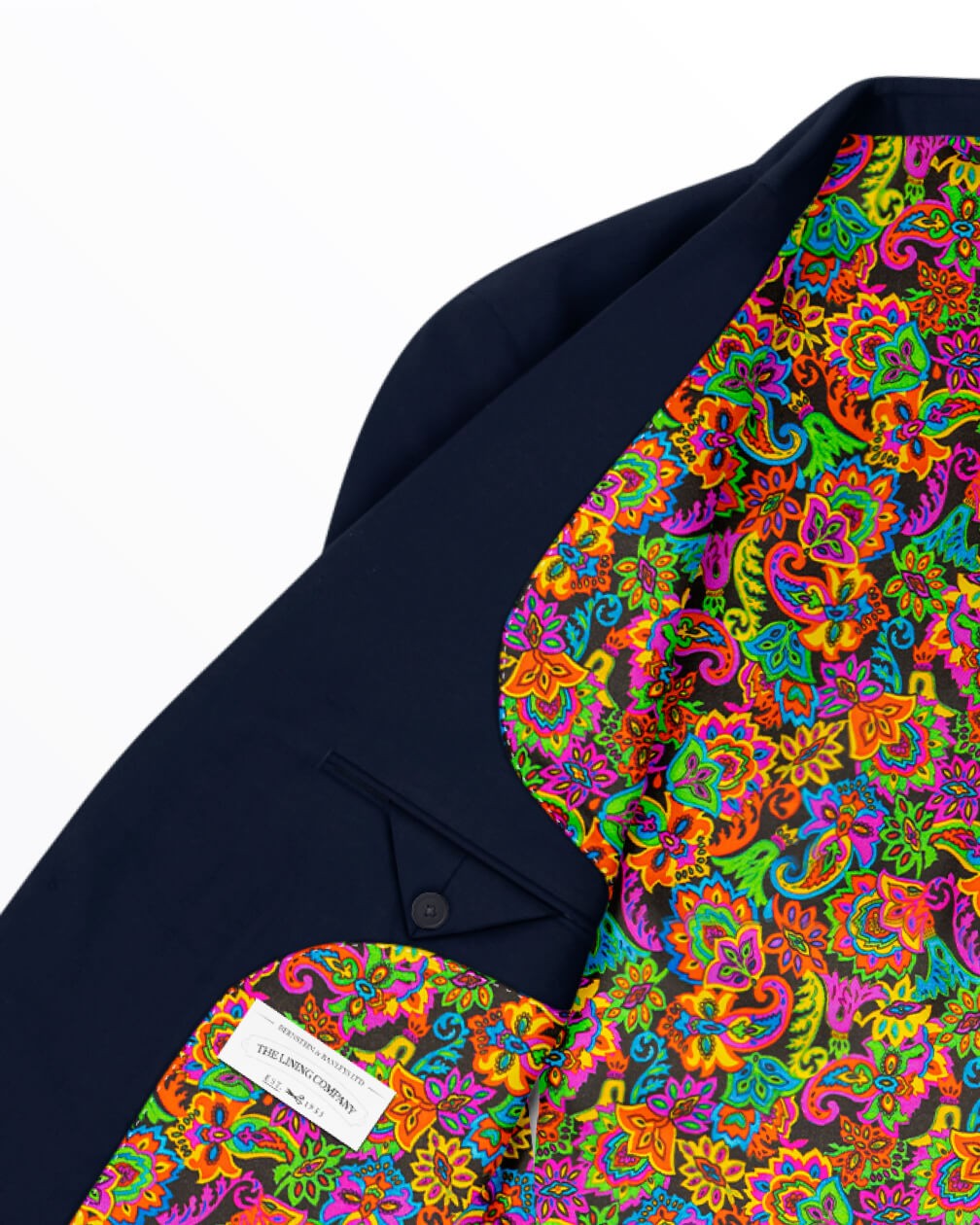 Proud Paisley takes the classic paisley form and reimagines it with fearless colour and striking composure. Energetic and unapologetic, this design combines the colours of the rainbow to amplify the traditional detailing to new heights. A statement finish that makes its presence known the moment a jacket opens.