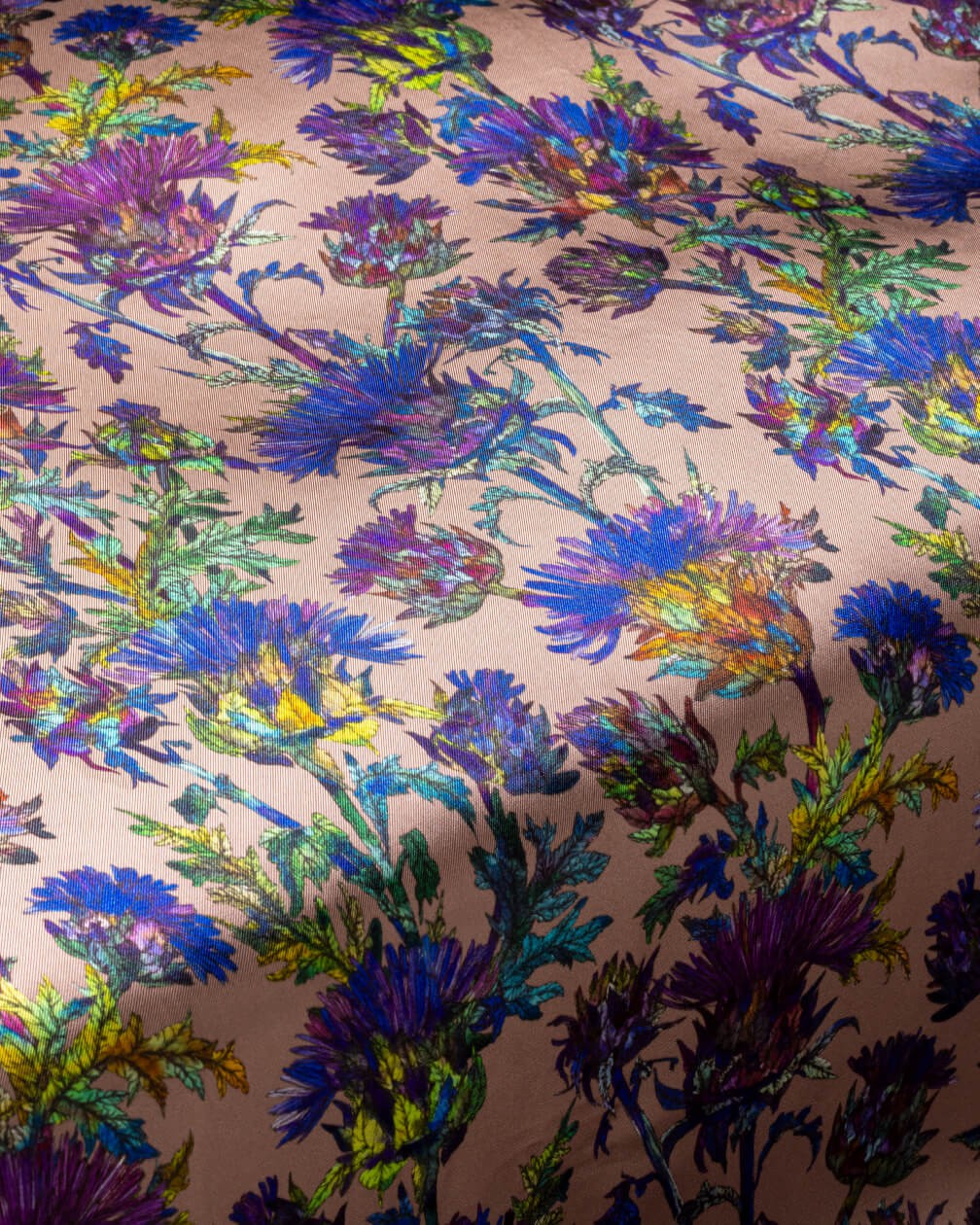 Celebrating Scotland’s most recognisable bloom, Thistles is a profusely expressive floral design that breathes beauty and resilience. Painterly thistles unfold in jewel-like tones, their textured forms carrying the essence of strength, heritage and pride. Rousing yet grounded, this composition imbues the historic significance of the thistle with a modern edge.