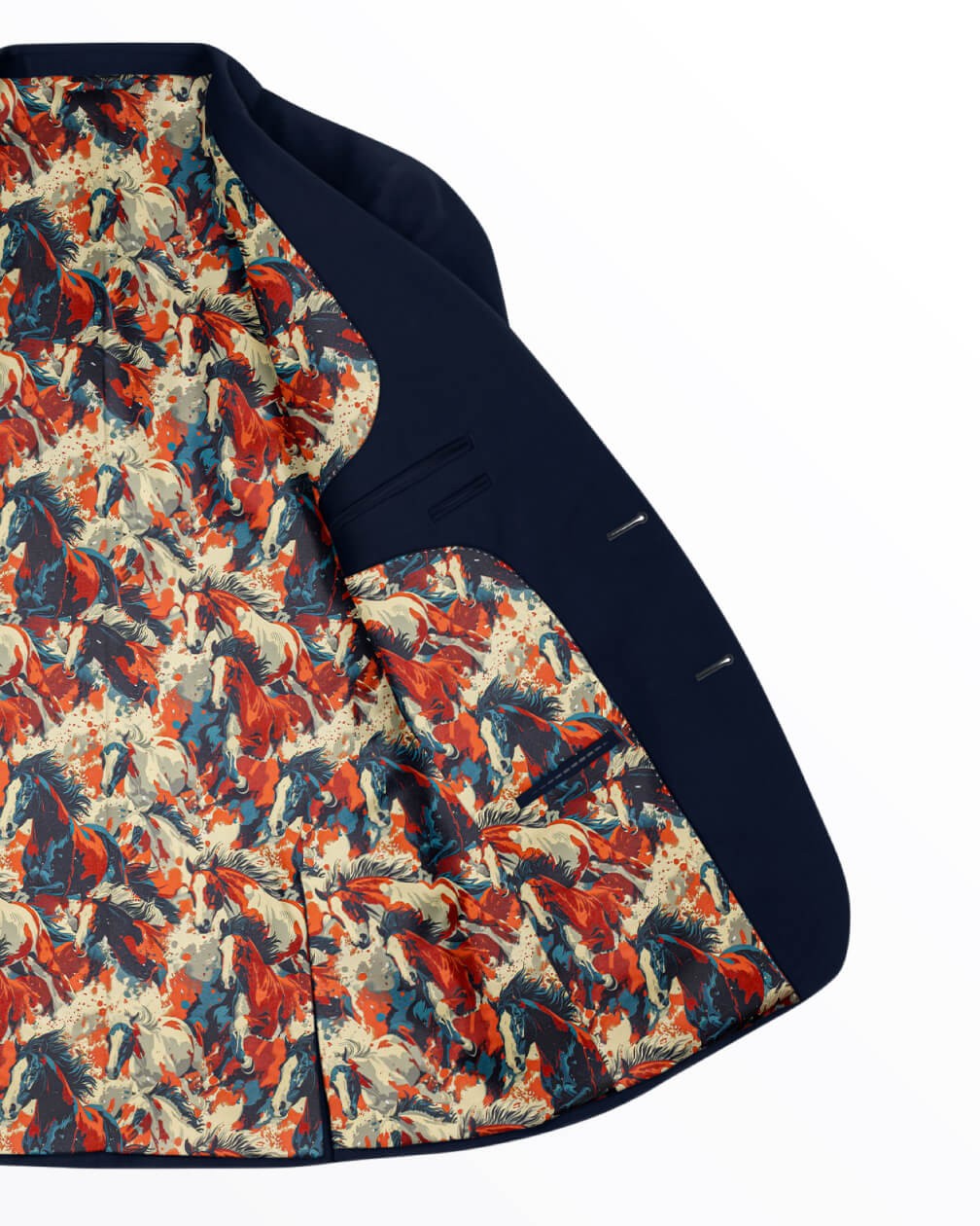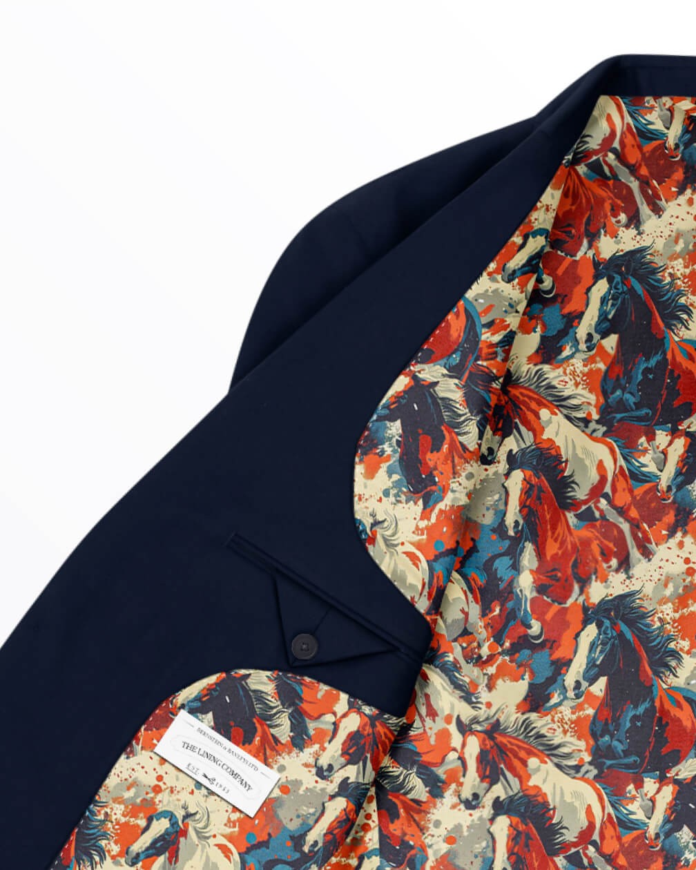 Eliciting the thrill of the racecourse, Thoroughbreds presents the speed, strength and prestige of pedigree horses through stirring brush strokes and a bold, modern palette. Dynamic contrasts of red, white and blue convey the performance of pure-bred stallions, resulting in a lining that feels fast, fearless, and full of horsepower.