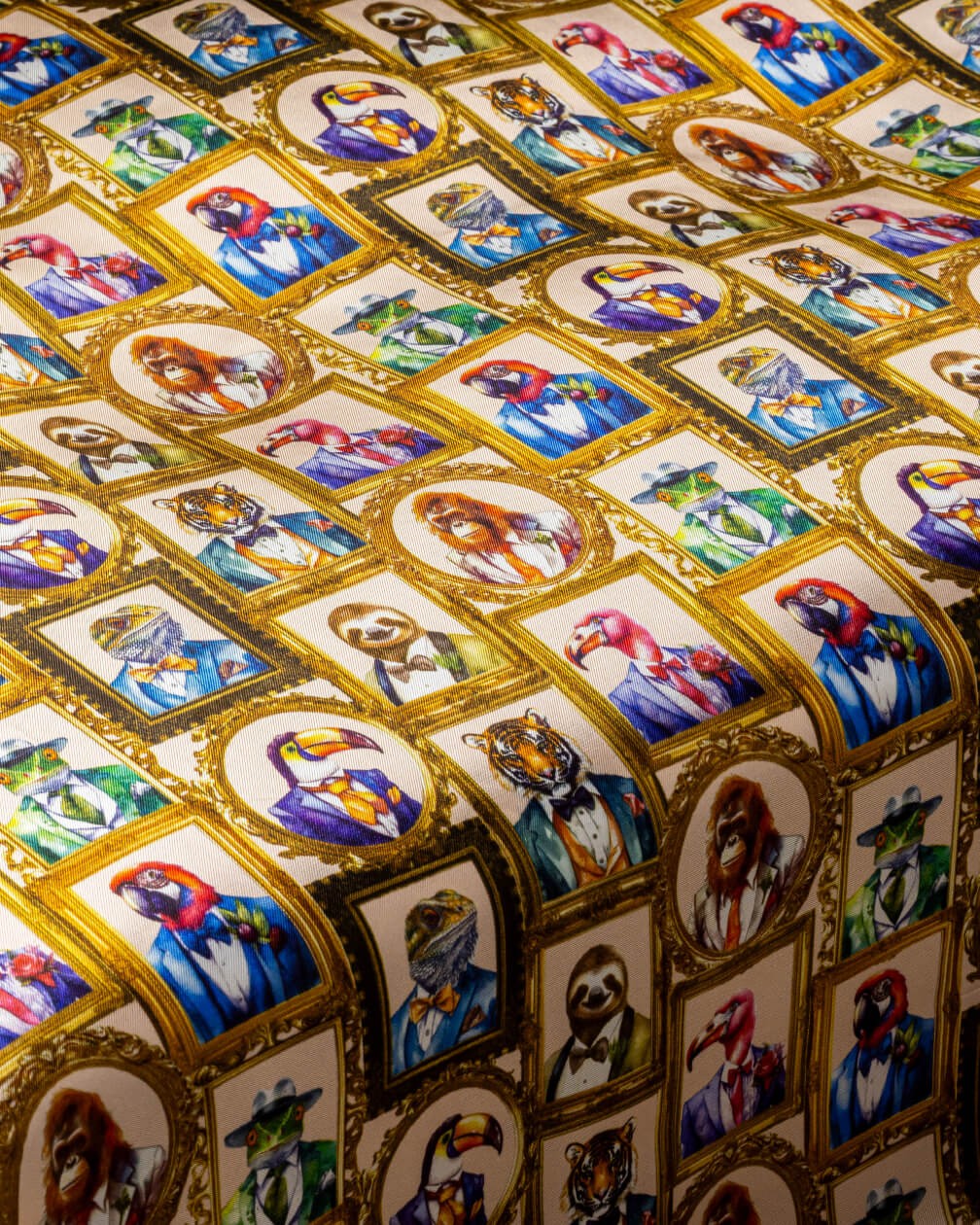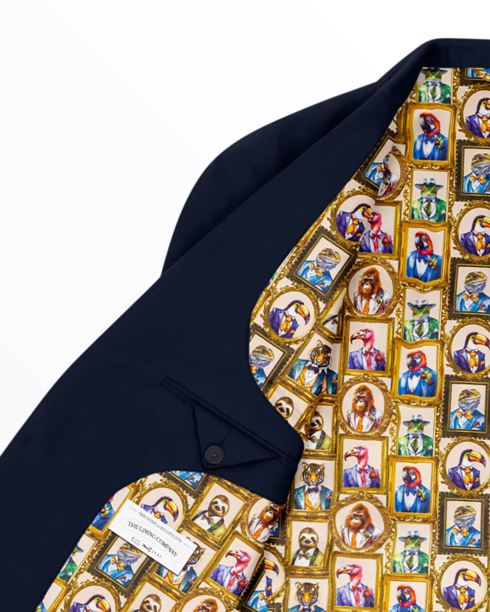 Tropical Suits reimagines a colourful cast of jungle and rainforest favourites as sharply dressed gentlemen. From exotic birds and lizards, to impressive tigers and orangutans, each tailored animal is set in ornate gold frames and presented like prized portraits in a collector’s gallery. A lining that adds an amusing tropical twist to any item of clothing.
